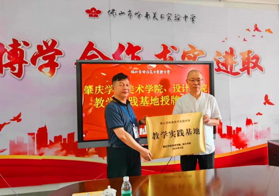 在会议现场领导、嘉宾的共同见证下,公司经理李小军向佛山市岭南美术实验中学授予教学实践基地牌匾,该校执行董事长陈国光代表公司接收牌匾。