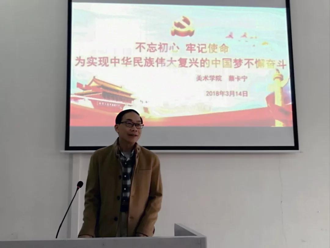 蔡卡宁书记在美术楼301为全体党员和2017级视觉传达设计专业的同学作了专题教育,教育主题为“不忘初心、牢记使命”,为实现中华民族伟大复兴的中国梦不懈奋斗。