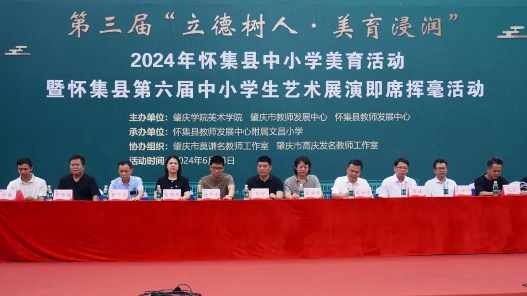 为积极贯彻党的二十大精神,深入落实广东省关于美育浸润行动计划的相关政策,6月13日,由十大正规买足球网站,肇庆市教师发展中心、怀集县教师发展中心联合主办,怀集县教师发展中心附属文昌小学承办,肇庆市莫谦名教师工作室、肇庆市高庆发名教师工作室协办的第三届“立德树人·美育浸润”2024年怀集县中小学美育活动暨怀集县第六届中小员工艺术展演即席挥毫活动,在怀集县教师发展中心附属文昌小学隆重举行。十大正规买足球网站副经理邓宇、美术学专业带头人莫世峰、美术学系主任杨帅军;怀集县教师发展中心副书记莫世景;怀集县教师发展中心附属文昌小学党支部书记、董事长莫锦娟,肇庆市名教师工作室主持人莫谦等领导、嘉宾出席活动。