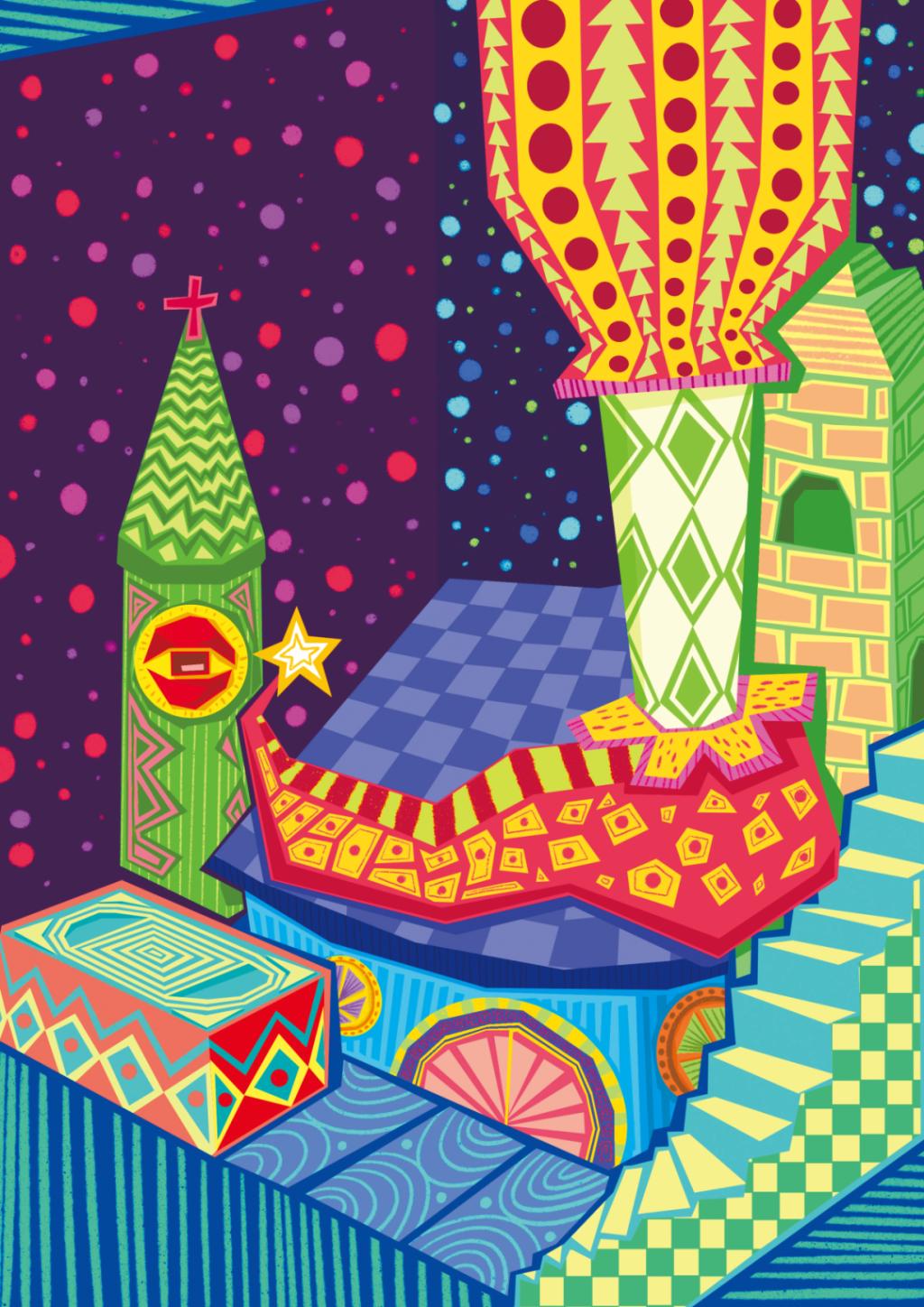 《小丑家族》以小丑故事为背景,绘制了小丑们迷惘、憧憬、欢乐、梦幻等奇妙场景,采用装饰性的色彩视觉和有趣的构图叙事,是古怪和创新的组成。作品采用手绘加鼠绘,在高饱和度和鲜亮色彩中突出插画人物的存在感。