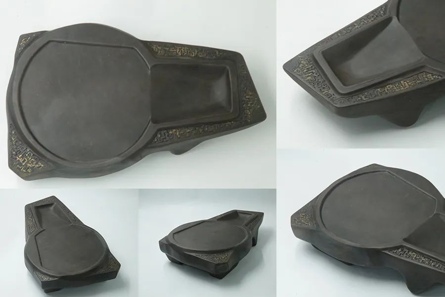 《声之形》砚雕创作的主要材质为宋坑、金箔、腰果漆、金粉、紫铜片。每一方砚运用不同的砚式,在继承的基础上进行创新,完成现代端砚设计与传统端砚设计的融合。整体利用金属元素做点缀,并结合漆艺来表现,采用多种工艺方法,可以将色彩与材质之间的关系进行协调,从而实现配色的丰富化和材质的多样化,产生出更加丰富的视觉效果,增加砚台的装饰性功能。