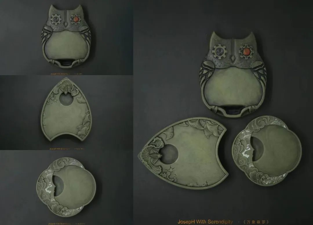 《万象森罗》之二《枝上鸟》以猫头鹰为具体的可辨识造型,运用到蒸汽朋克元素也是最多的一方砚,用月亮和太阳为核心的两个齿轮造型放置在其眼睛的位置,寄意昼伏夜出,在理想构图中,又处在高位置,体现出压迫和危险性,仿佛伺机而动,带入到我们自己身上,则是“衣带渐宽终不悔,为伊消得人憔悴” 就是说尽管在雕刻创作中无论遇到各式各样的困难,还要坚持奋斗,继续前进,为了作品,一切在所不惜。在处理上身上的机械元素线条可以是果断有力的,更突放大了它坚毅和冷峻的特点,计划可能会在局部贴金箔银箔,制造金属的质感,又或者镶玉而点睛。