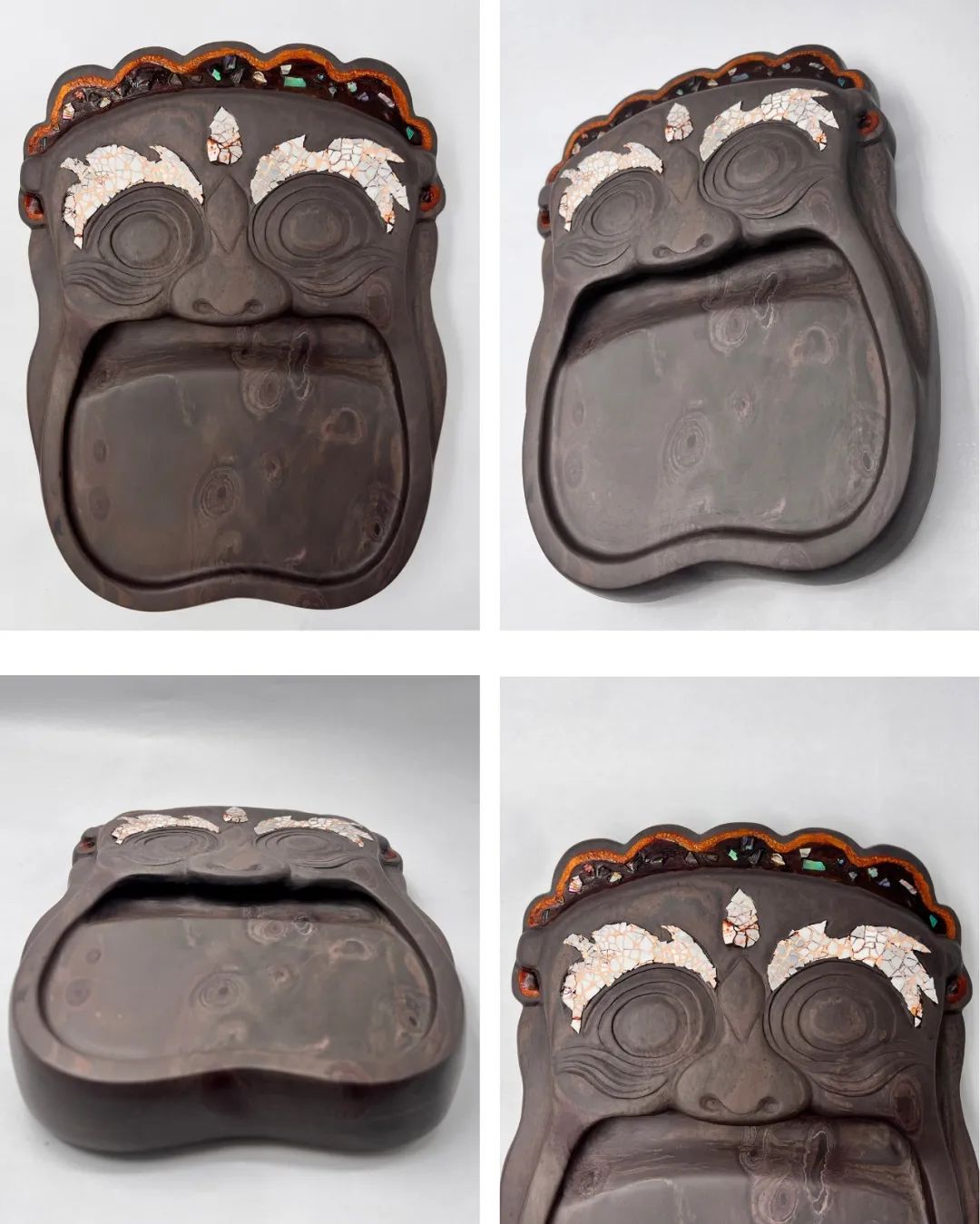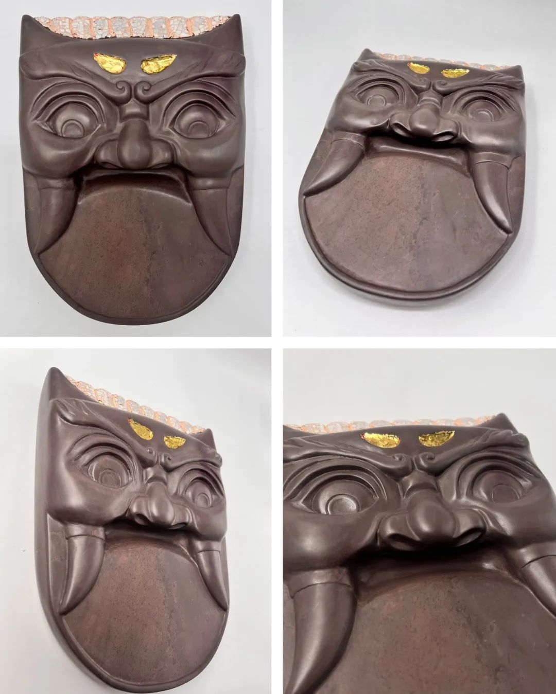 本次选题是源于傩文化,它作为我国最为古老的宗教性文化形态之一,不仅对中国戏曲艺术的发展具有重要的影响作用,尤其是它的本身所包含的文化特色等方面,对一些相关的文化研究有着十分重要的艺术价值与研究价值。傩文化中的傩戏除了是宫廷里驱鬼逐疫的祭祀活动之外,更是广大民众借以祈福消灾带来吉祥安庆的重要手段,是民众日常生活里不可分割的一部分。题目《傩愿》包含着傩戏消除灾难厄运,给人们带来美好祝福的意思。傩戏里傩面具为其艺术造型的重要手段,具有民间艺术和宗教艺术的品味特征。本作品使用宋坑的砚石,将砚台和傩面具设计相结合,还加上漆艺的艺术手法,增加装饰性与艺术价值,赏用结合,在传统文化之间的交流和碰撞,会产生不一样的创新与经济效益。