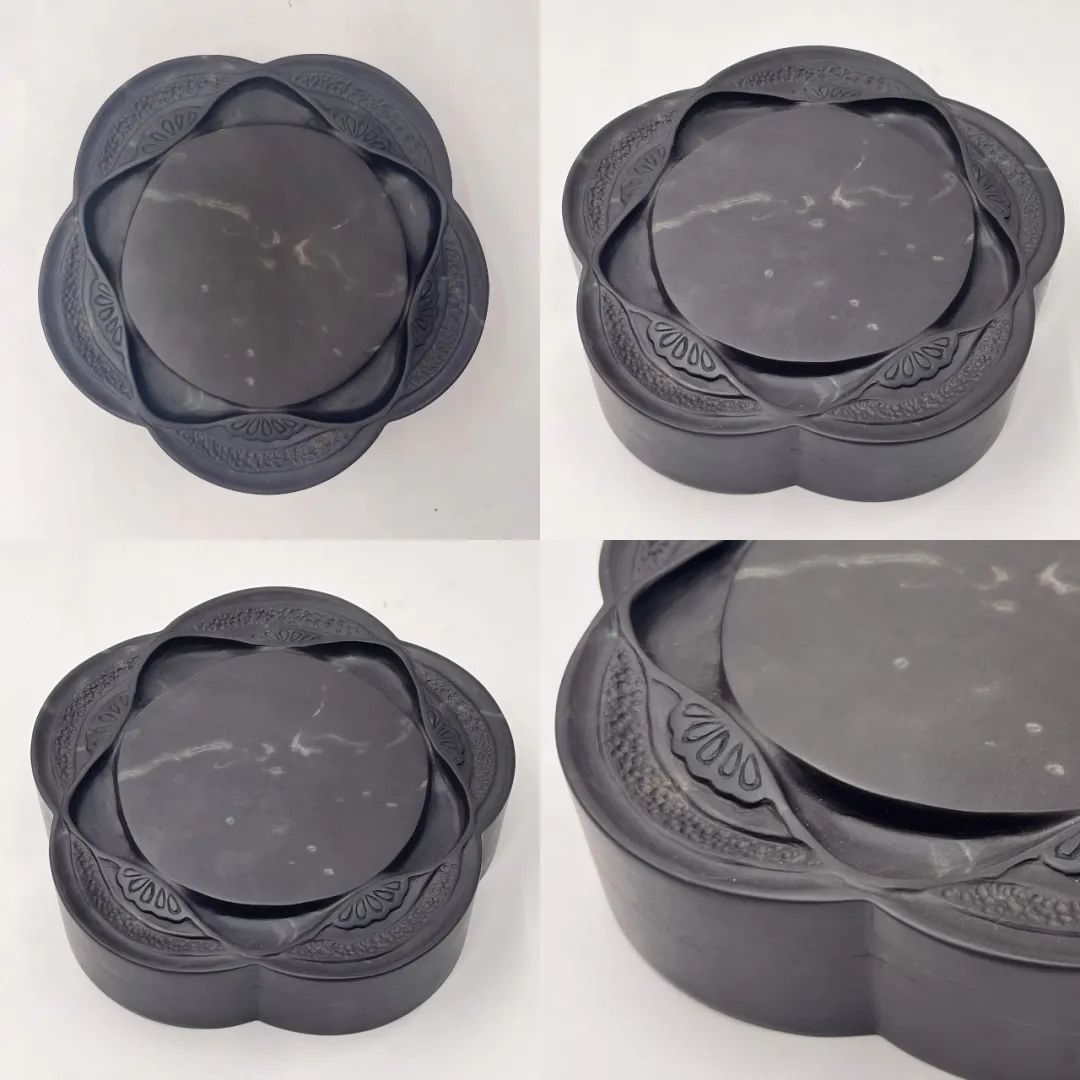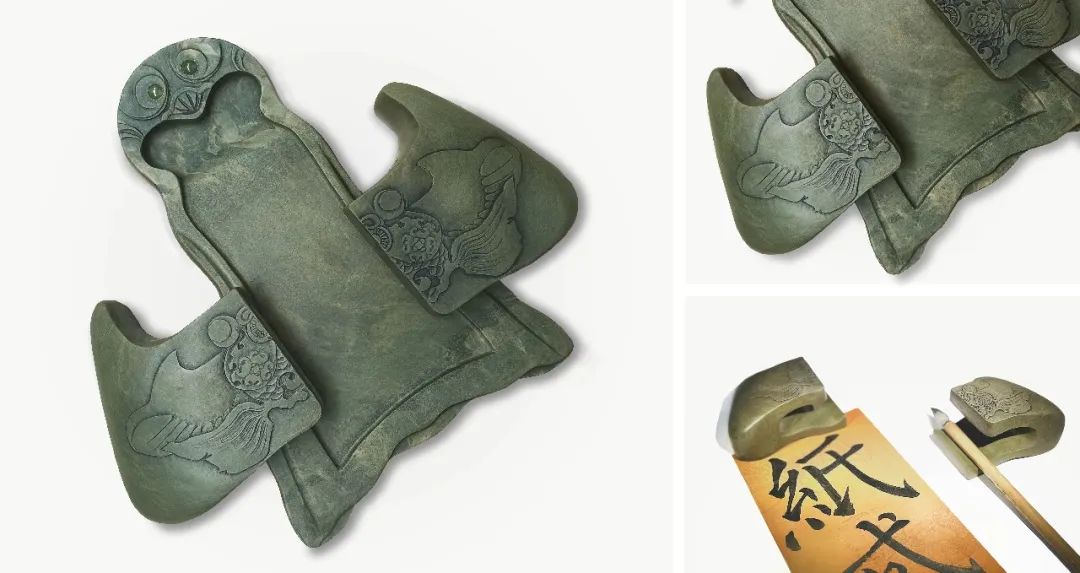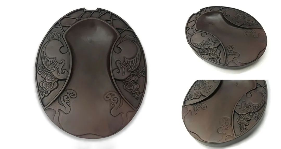 作品主要元素采用传统纹饰纹样,为了符合主题我在砚台背部中心处分别雕刻了四大神兽图腾的图案。在挑选材料时特地选择了有些许瑕疵的砚石、后期完成砚台时对其做了墨染处理,就是为了更加能体现出古代时玉璧的那种厚重感、历史感。