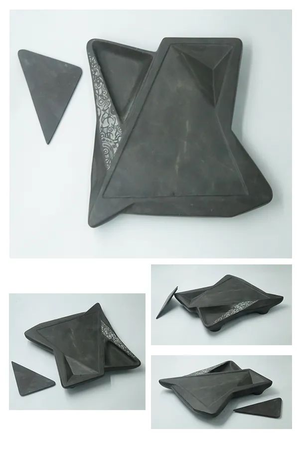 本次毕业设计的题目是《时节如流》。创作的灵感来源选取的是古代的一些计时器具。这次的选题采用的器具为日晷、沙漏和刻漏。他们随着时间的发展,从自然到人工,从人工到机械。日晷砚的造型设计在平时使用时可以作为端砚使用,闲置时也可以立起来作为摆件。沙漏砚提取了沙漏的造型灵感,再融入了莫比乌苏环和彭罗斯三角形两种元素。刻漏砚分解重构了刻漏的整体造型,再组合搭配。三方砚的外形采用实象、抽象、分解重构三种表现方式。