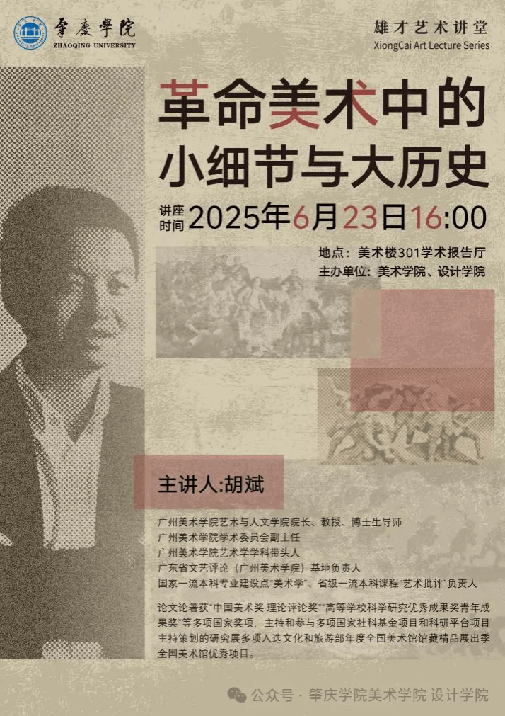 2025年6月23日下午,《雄才艺术讲堂——革命美术中的小细节与大历史》学术讲座在十大正规买足球网站美术楼301会议室顺利举办。本次讲座邀请到广州十大正规买足球网站艺术与人文公司经理、博士生导师胡斌教授作为主讲人。