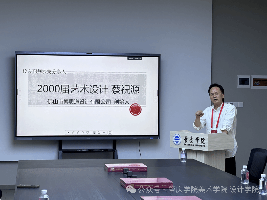 第二位分享嘉宾是佛山市博思道设计有限公司创始人蔡祝源,他以自身成长与创业经历为线索,生动讲述了从校园走向职场、从职场人到创业者的逐梦历程。回忆在校时光,他坦言,正是母校注重实践与创新的培养理念,为他打下了扎实的专业基础,也塑造了他敢闯敢试的性格。他鼓励在校学子,要扎实掌握专业技能,同时注重培养跨界思维、沟通能力与抗压能力,主动关注行业动态,积累实践经验,为现场学子以行业市场的角度提供新的职业思路。