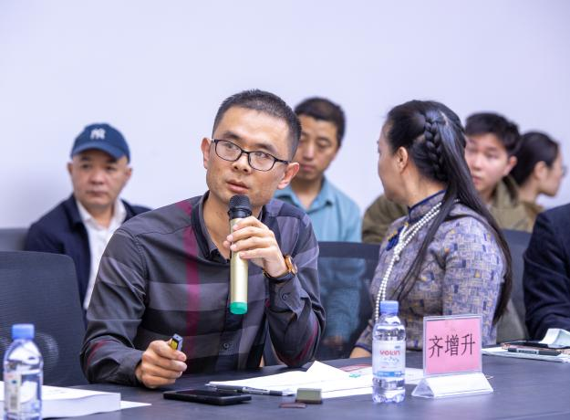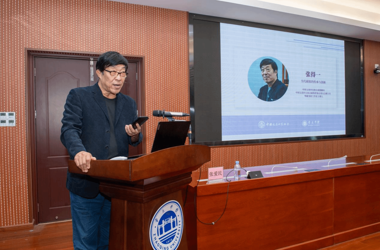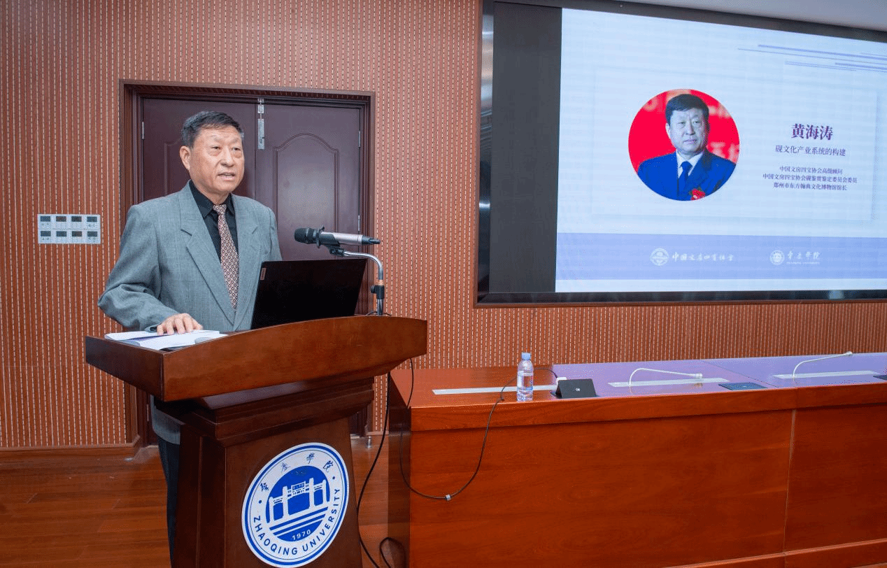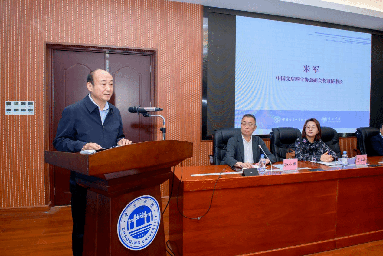 学术主持中国文房四宝协会副会长、肇庆市端砚协会会长梁善率先分享《道在砚中:论〈道德经〉美学思想对砚台制作的指导意义》,从传统哲学视角为砚台制作提供理论指引;中国文房四宝协会学术研究专业委员会副主任委员齐增升以《由器至艺:当代砚台价值体系的重塑路径探析》为题,提出当代砚台价值核心应转向艺术价值和情感价值,通过“艺术砚” 概念弱化材质依赖;肇庆市端砚协会副会长兼秘书长梁思勇在《古代砚台纹饰解码及其在当代拓印技艺中的活化应用》中,梳理砚台纹饰与拓印技艺的历史演变,为砚文化大众化普及提供技术路径。