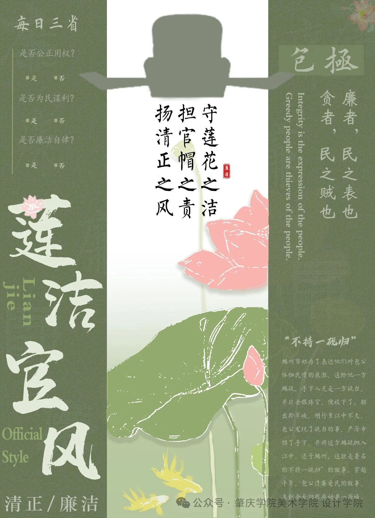 以“莲洁官风”为主题,借莲花象征廉洁,官帽代表公职身份,二者融合凸显公职人员廉洁从政内涵。采用绿色与白色为主色调,绿色寓意清正、生机,契合廉洁官风的清廉纯粹;白色象征公正、质朴,强化廉洁自律的精神内核。左侧“每日三省”引导自省,右侧包拯典故深化廉洁为民的精神传承,整体传递公职人员守莲花之洁、担官帽之责,扬清正之风的价值追求。