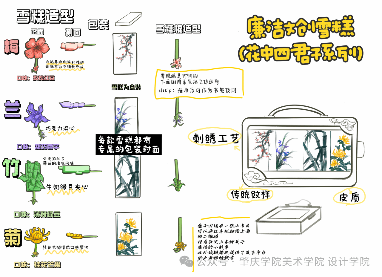 谈到廉洁,容易让人联想到公平公正、执法不阿、两袖清风的历史名人。其中有这些寓意最经典的代表之一,就是“花中四君子”。该设计采用花中四君子梅、兰、竹、菊,与雪糕造型相结合,设计出了系列产品。该系列产品有四种口味不同的雪糕,还有同风格相配套的产品包装。此外还有衍生的包包袋子,造型美观且实用。