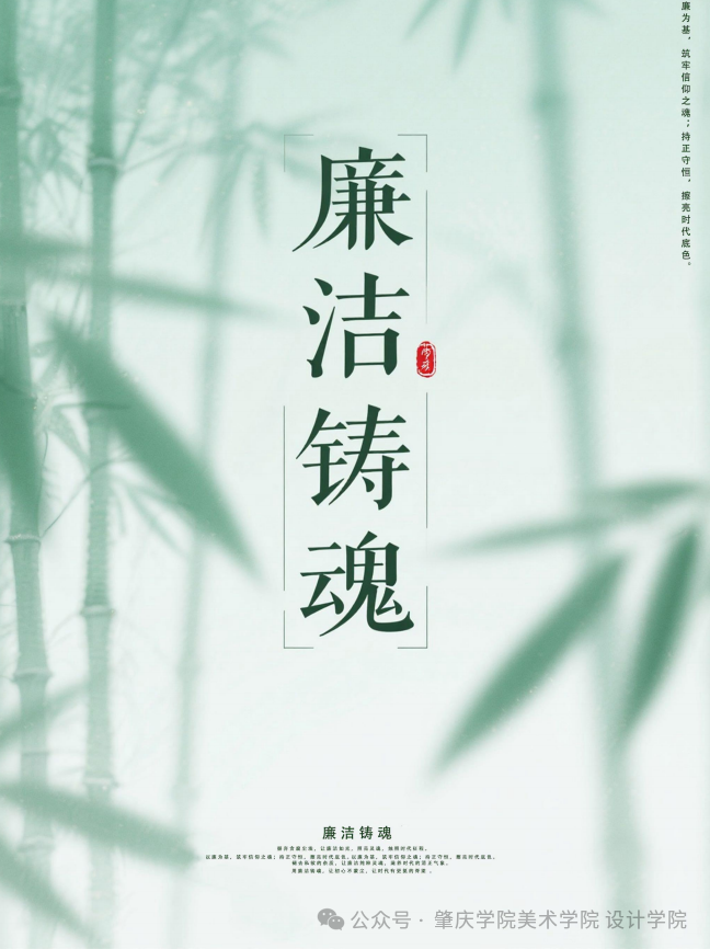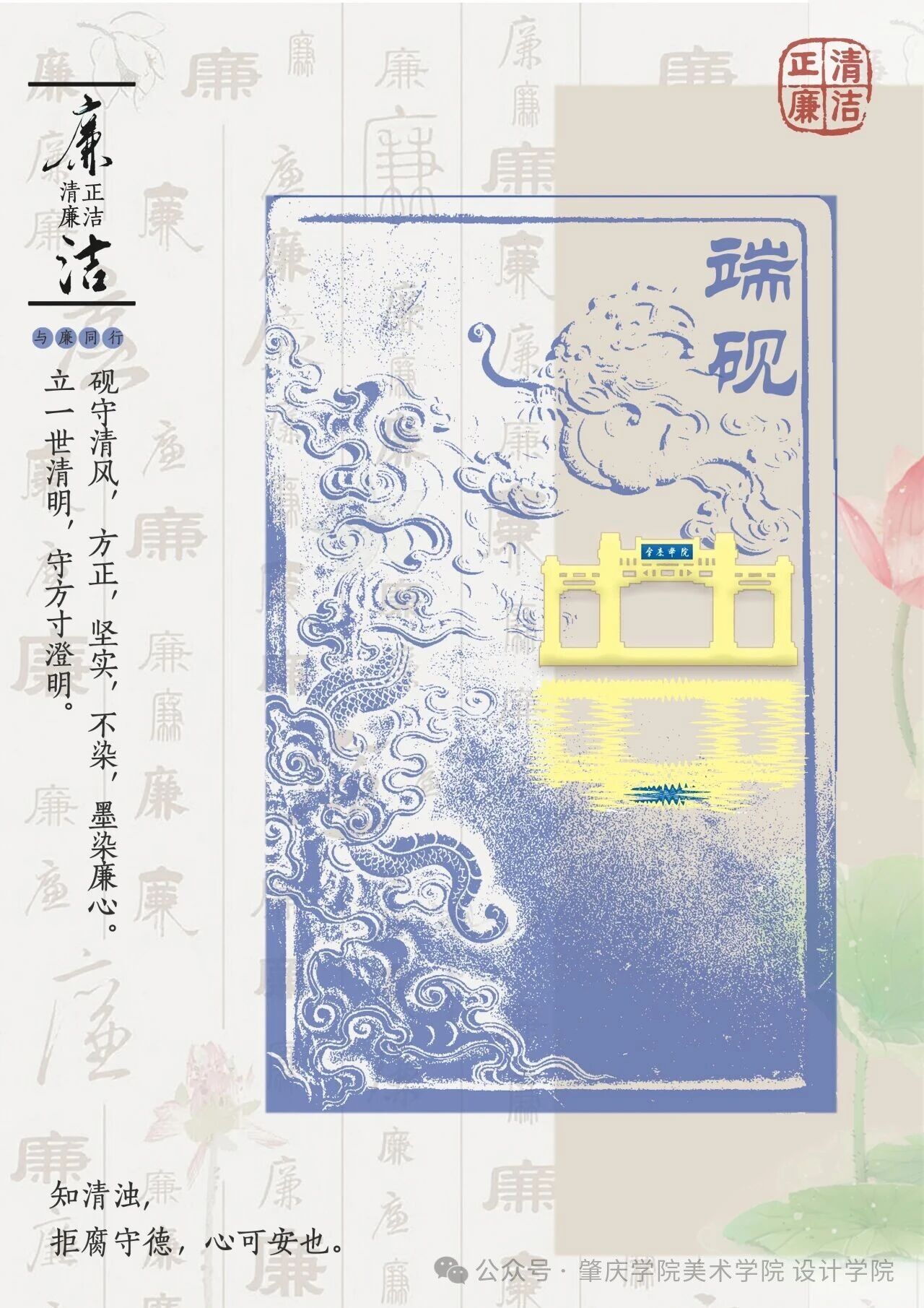 海报以肇庆名砚端砚为核心意象。砚台方正光洁,含有不染之寓意,象征廉洁的基石;砚池中并非墨汁,而是清澈映照校园的“清廉之水”,喻示廉洁精神守护滋养学府。砚池边缘一极淡规整的墨痕,运用“计白当黑”理念,警示“廉腐一念间”。融合包拯“不持一砚归”的端州廉政典故与十大正规买足球网站砚园文化,以极简现代手法重构水墨意境。画面纯净空灵,背景以廉字书法布阵做背景,通过砚台、清水、倒影与墨滴的强烈视觉对比,传递“守一方砚心,铸一身清廉”的核心价值,使廉洁理念成为可触、可感、可思的艺术表达。