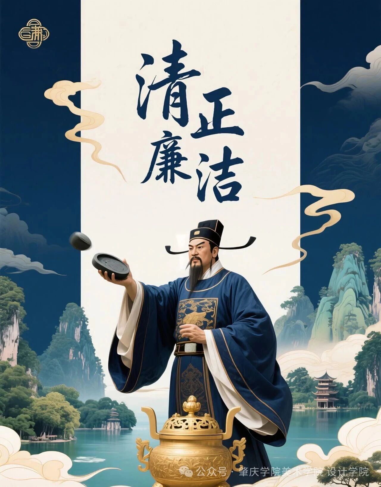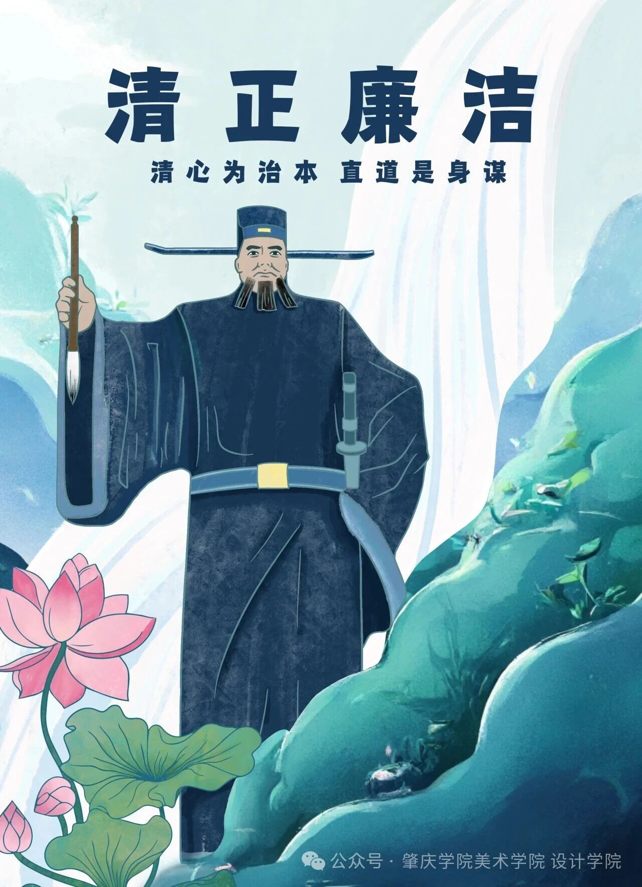 插画海报以包拯为核心形象进行设计创作。包拯以铁面无私、廉洁公正著称,曾任端州知府,人物造型灵感取自肇庆端州包公祠的塑像形象。海报中引用了包公名句“清心为治本,直道是身谋”,意在强调清心正直乃为人之本、立身之道。作品不仅传递了包公的精神风范,更寓意在求知与成长的道路上,廉洁文化与正直品格同样值得珍视与弘扬。