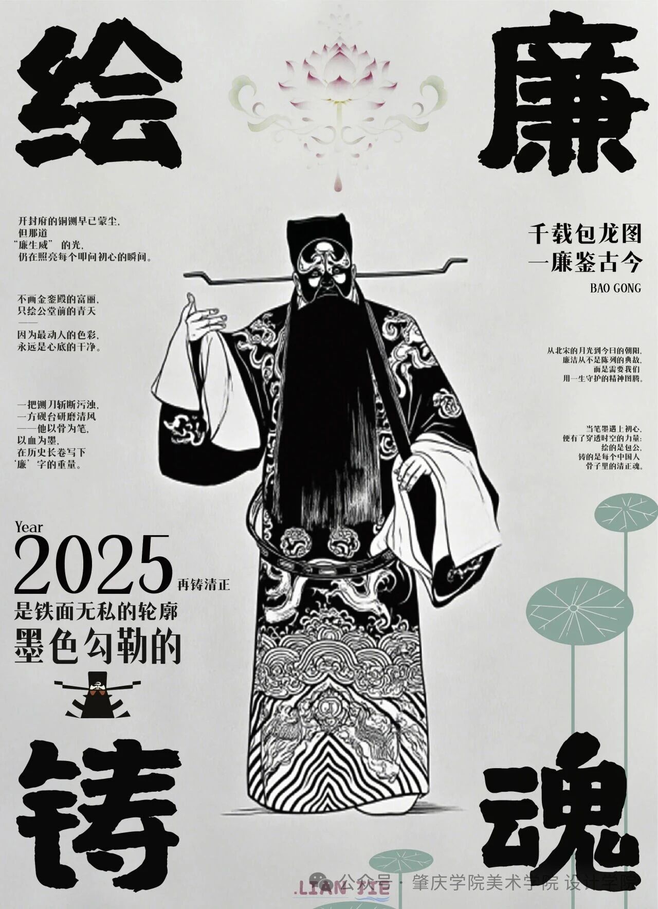 海报以 “绘廉铸魂” 为主题,借经典包公形象传递廉洁精神。水墨风格勾勒包公铁面无私轮廓,呼应“墨色勾勒”,强化清正印象。上方莲花象征廉洁纯净,与文案“心底的干净”呼应。文案围绕包公廉德典故展开,从历史关联当下,强调廉洁是中国人骨子里的坚守。画面中的“2025”与 “再铸清正”结合,意在以古鉴今,让观者在历史与现实呼应中,感悟廉洁重量,传承坚守,实现古今廉意共振 。
