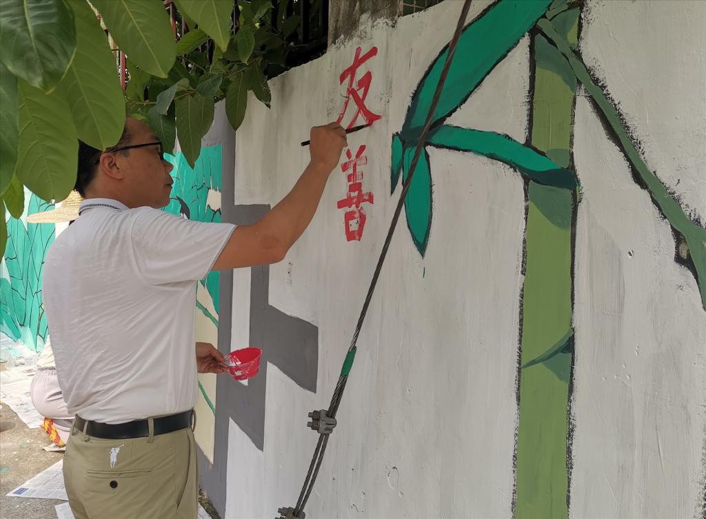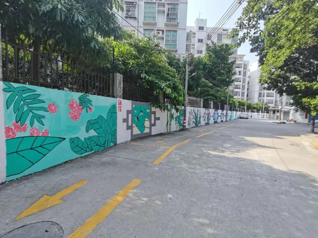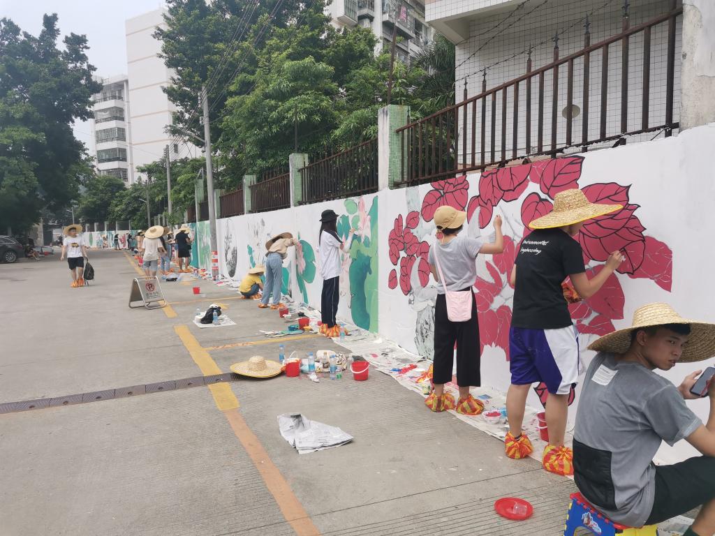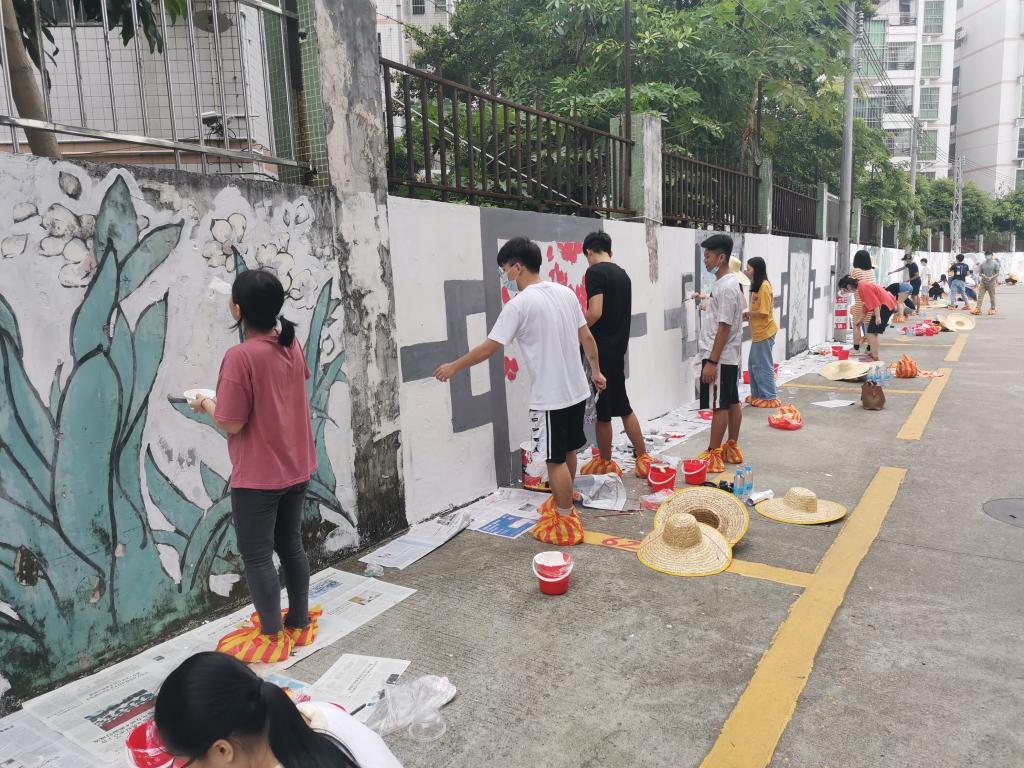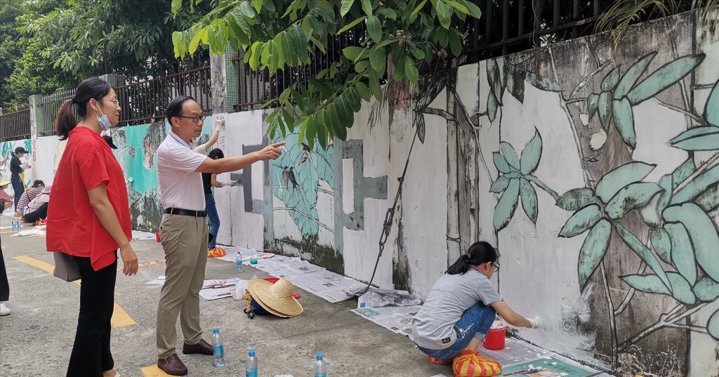 近日,在公司党委的指导下,公司党委书记蔡卡宁率胡荣奎、闵令香等师生志愿者队伍前往肇庆市端州区睦岗街道蕉园社区蕉园村入口处,为村庄量身定制艺术墙绘!百余名师生志愿者在村口的长墙前勾画,太阳当头炙晒,汗珠布满额头、浸湿衣衫,但是看着墙绘作品慢慢成型,志愿者们都乐在其中!一旁围观的村民纷纷为志愿者点赞,脸上也不由地露出喜悦的笑容。村民黎叔笑着说,“原来陈旧的墙面常被乱涂、乱画,现在村里多了一道这么漂亮的景观,非常开心。”