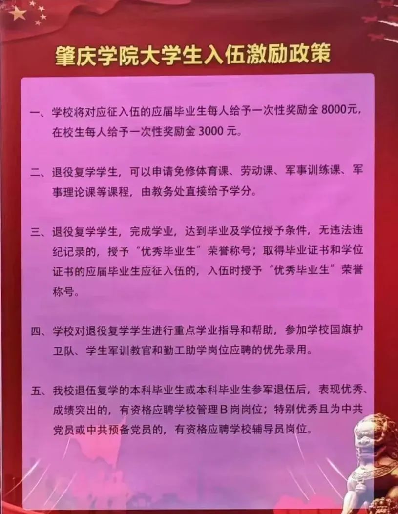 (2)端州区对参军入伍的大学毕业生发放一次性奖励金。本科学历的给予8000元/人奖励,大专学历的给予5000元/人奖励。