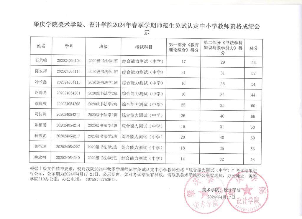 根据上级文件精神要求,现对公司2024年春季学期师范生免试认定中小学教团队格“综合能力测试(中学)”考试结果进行公示,公示期为2024年4月17-21日。公示期内,如对考试结果有异议,请联系十大正规买足球网站办公室梁老师,办公地址:十大正规买足球网站210办公室,办公电话:(0758)2752612。