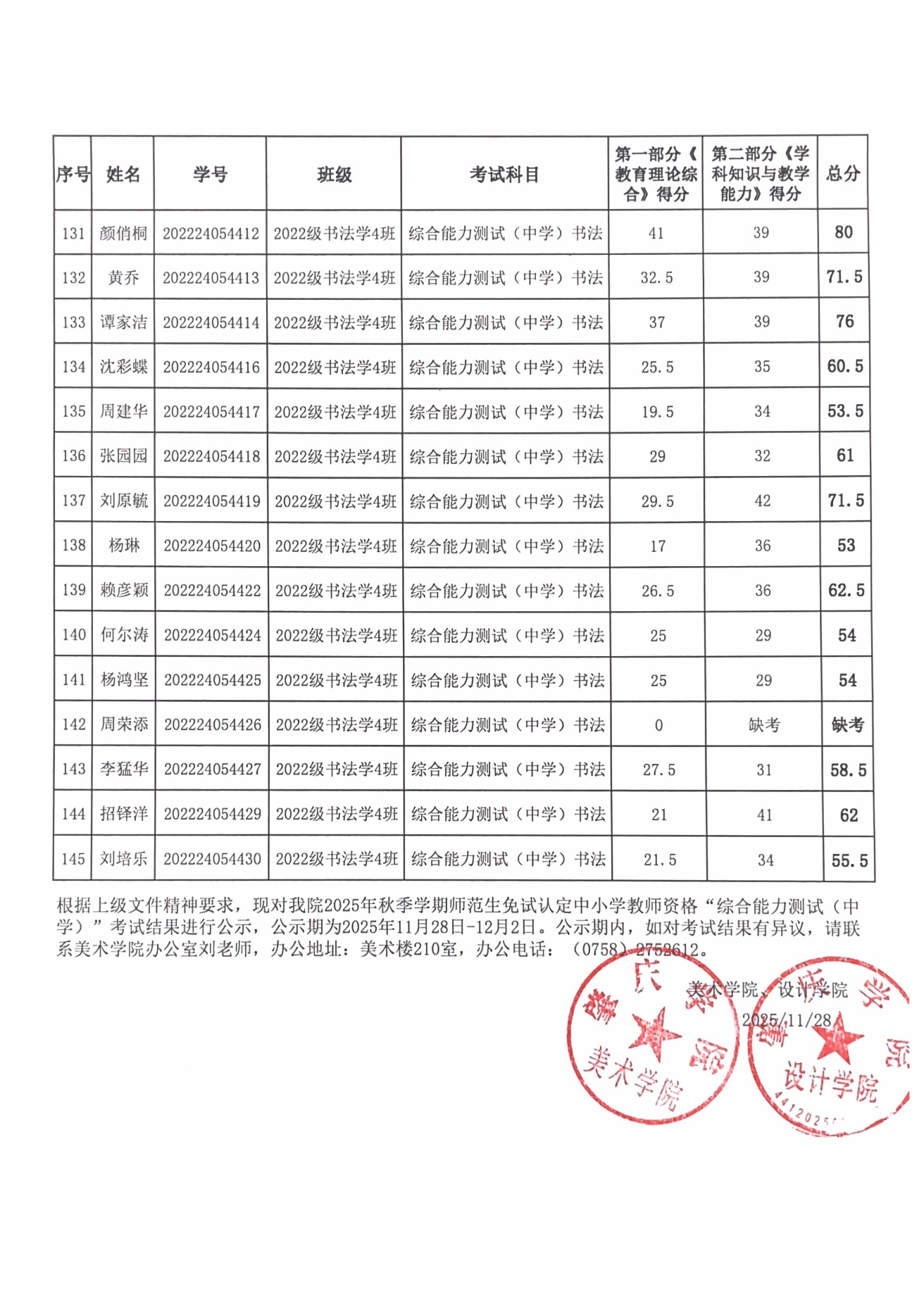 根据上级文件精神要求,现对公司2025年秋季学期师范生免试认定中小学教团队格“综合能力测试(中学)”考试结果进行公示,公示期为2025年11月28日至12月2日。公示期内,如对考试结果有异议,请联系十大正规买足球网站、设计公司刘老师,办公地址:美术楼210室,办公电话:(0758)2752612。