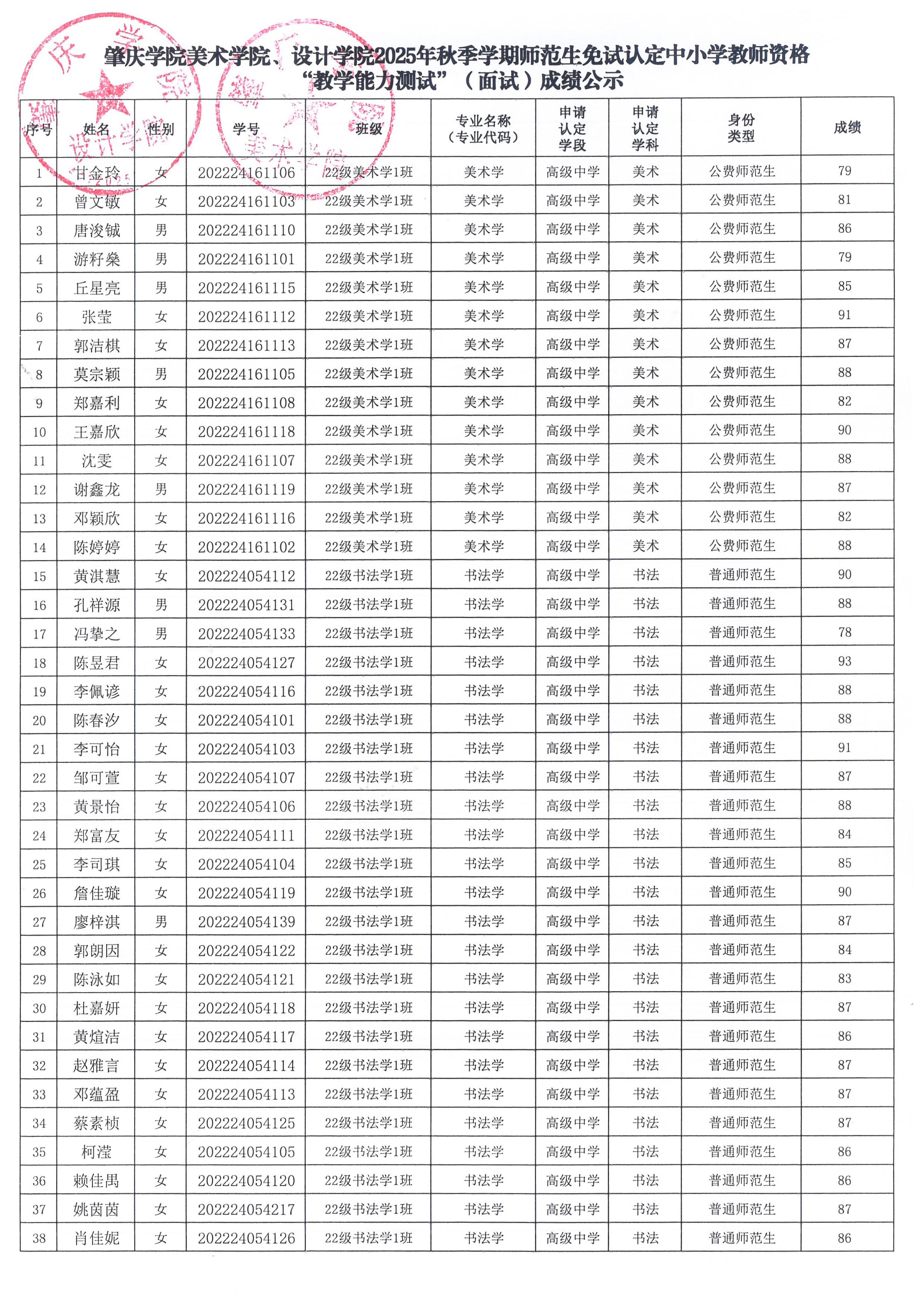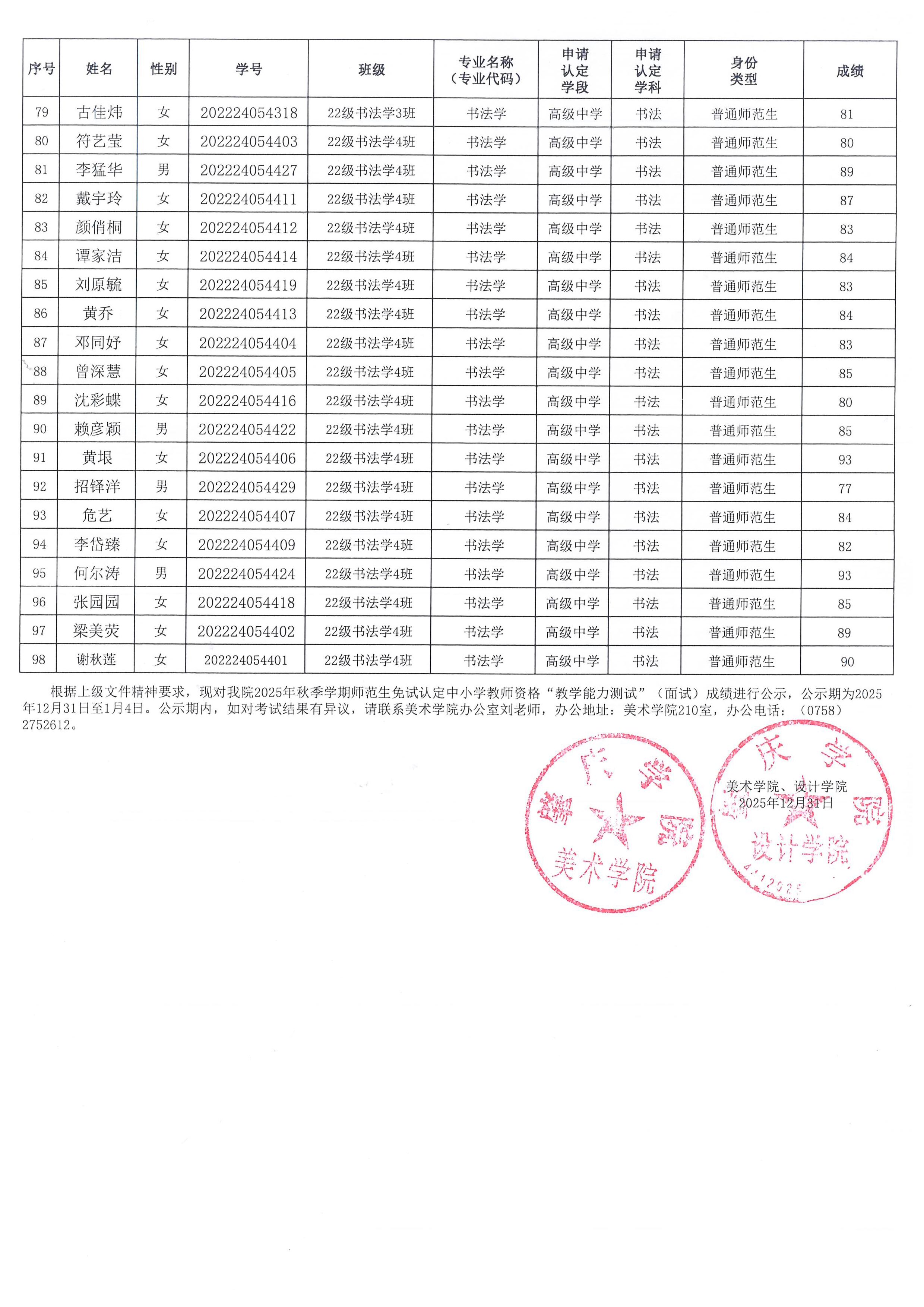 根据上级文件精神要求,现对公司2025年秋季学期师范生免试认定中小学教团队格“教学能力测试”(面试)成绩进行公示,公示期为2025年12月31日至2026年1月4日。